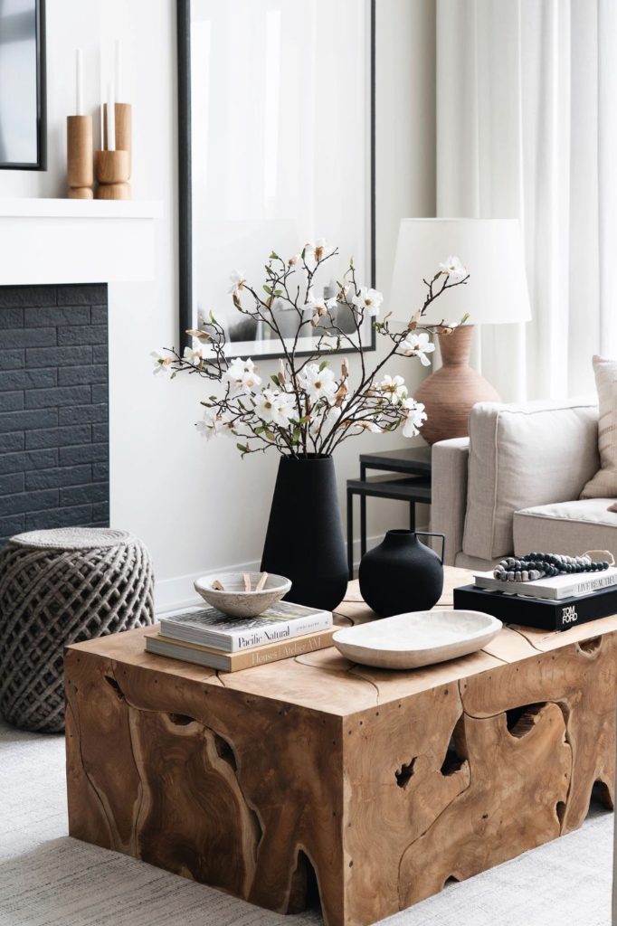 En el salón-comedor, es ideal que tengas una pieza noble de madera con un diseño refinado de alta calidad, cómo puede ser una mesa de centro de madera rústica, un aparador, la mesa de comedor o las sillas. Este detalle aportará mucha elegancia a tu estancia, además de calidez que aportará el material madera. ¡Pero ojo, sólo pon una pieza o dos cómo máximo! Para que capte la atención inmediata de la estancia. Si pones demasiadas piezas el espacio se verá abarrotado y no te resultará acogedor. Cómo consejo, te recomiendo que pongas, como pieza de alta calidad, la mesita de centro. ¡Te voy a poner algunos ejemplos!
