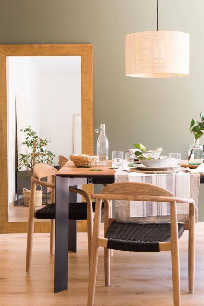 En este comedor, se puede ver como se han elegido sillas de madera natural, que le dan esa calidez al espacio. Además, gracias a la madera del espejo a la mesa, se puede aportar aún más calidez al espacio. La calidez hace que un espacio sea acogedor.