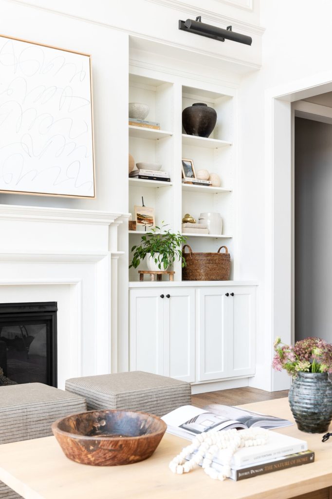 - Iluminación focal: para poder destacar estanterías o cualquier elemento decorativo que desees resaltar en el salón. Si tienes una librería, ponle un lámpara de acento que la ilumine directamente. O, por otro lado, si quieres destacar una obra de arte, ponle un punto de luz encima. Esto añadirá un toque de sofisticación y elegancia al espacio.
