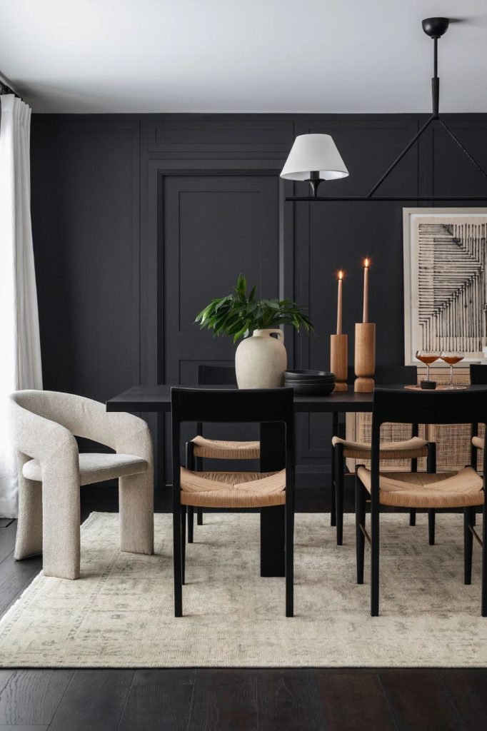 Esta pared en negro junto con la puerta, la mesa, las sillas y algún elemento decorativo, hacen que el conjunto se vea especialmente elegante y sofisticado. ¡No les tengas miedo a los tonos escuros!